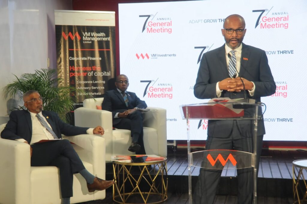 Rezworth Burchenson (at podium), CEO of VM Investments Limited (VMIL), addresses shareholders during the 7th VMIL Annual General Meeting.  Looking on is Michael McMorris (left), Chairman of VMIL, and Courtney Campbell (centre), President and CEO of the VM Group.  The AGM was held at the VM Group corporate office in Half-Way Tree on Thursday, July […]